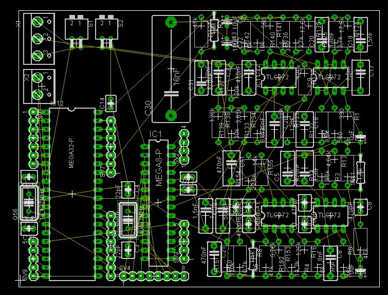 Übel, übel, Deine Platine: a.) Keine Abblockkondensatoren an den Controllern. b.) Quarze von den Controllern einen halben Kilometer entfernt. c.) Versorgungsspannungsleitungen viel zu dünn. d.) Kein Masse-Konzept. e.) Rückkoplungsnetzwerke an Deinen OPV viel zu weit entfernt. f.) Signalleitungen unter den Quarzen. g.) Analog- und Digitalteil nicht räumlich getrennt. Das ist ja noch schlimmer als ein Steckboard-Aufbau. Wenn das Teil halbwegs reproduzierbar funktioniert, grenzt das an ein Wunder. Vielleicht bekommst Du ja von den 10 Bit der Analog-Digitalwandler unterm Strich noch etwa 6 Bit raus, mehr wird es wohl nicht werden, der Rest ist Rauschen und Störungen... Also, kurz zusammengafasst, in harten Worten: Dieses "Layout" ist Schrott und Pfusch.