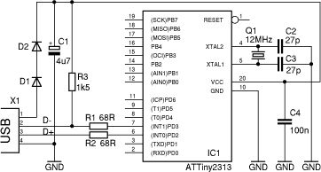 Hallo, ich hab' da ein paar Fragen zu den beiden Schaltplänen. Bei beiden liegen an D+ und D- jeweils ein 68Ω Widerstand. Wozu? Und wozu sind die Z-Dioden an D+ und D- im Metaboard-Plan? Der Atmega kann doch 5V und im obdev-Plan sind die gar nicht. Dafür sind im obdev-Plan 2 Dioden (D1 und D2) in Reihe. Auf der Webiste steht: > "D1 and D2 are a low cost replacement for a low drop 3.3 V regulator chip, such >as the LE33. Operating the AVR at higher voltages exceeds the common mode range >of many USB chips. If you need to run the AVR at 5 V, add 3.6 V zener diodes at >D+ and D- to limit the voltage." Warum muss ich auf 3,6V runterregeln, wenn ich den avr mit 5V betreiben will? Was mir im Metaboard-Plan noch aufgefallen ist, an D+ hängt noch ein 1MΩ Pull-down, der ist im obdev-Plan aber nicht. Jemand ned Idee wozu der da ist? Danke! Und bitte nich gleich hauen :)