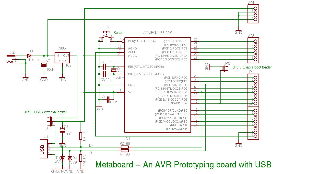 Also die 68Ohm sind einfach als Schutzbeschaltung was die USB Schnittstelle und den Mega angeht gedacht. Der 1MOhm Widerstand ist würde ich sagen eher was in Richtung ESD würde ich sagen. -> Unnötig wenn man einfach mal so einen Prototypen baut oder einfach nur rumspielen möchte ! Schöne Grüße