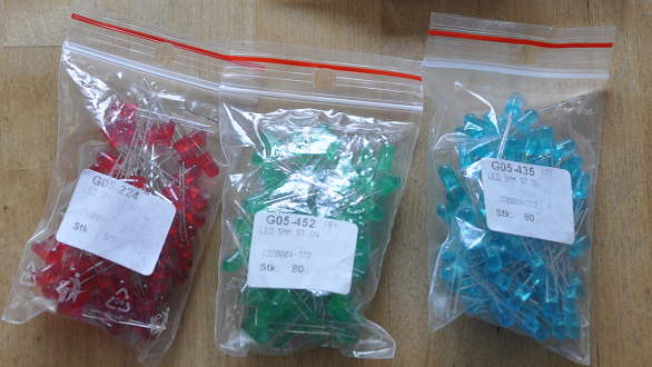 Leds in allen möglichen Grundfarben :) 80Stück pro Farbe, nicht aus China, sondern von Reichelt http://i.imgur.com/0Wz91.png