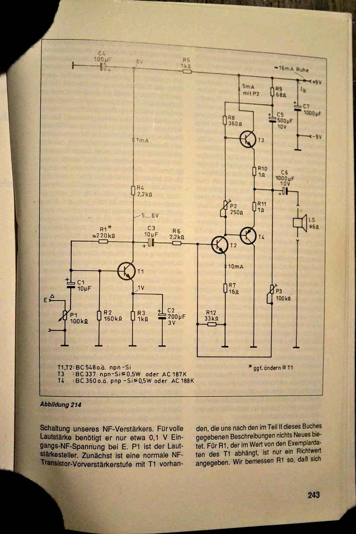 Hallo miteinander Ich habe aus dem Buch "Radiotechnik und Elektronik" von Hagen Jakubaschk auf Seite 243 folgenden Schaltplan für einen Gegentaktverstärker gefunden. Als ich den Verstärker nachgebaut habe, wurde der Klang allerdings sehr verzerrt. Die Verzerrungen nahmen mit zuhnehmender Lautstärke zu. Deshalb habe ich mit dem Oszilloskop mal an der Basis von T4 das Signal gemessen. Dabei habe ich herausgefunden, dass das Tonsignal mit zunehmender Lautstärke oben und unten abgeschnitten wird. Weiter ist mir aufgefallen, dass die Amplitude, die das Signal maximal annehmen kann, bevor es verzerrt wird genau gleich hoch, wie die Speisespannung, nämlich 9V ist. Wenn man die Lautstärke allerdings genau bis zu dem Beginn der Verzerrungen einstellt, klingt es sehr leise. Nun habe ich mir gedacht, könnte man die Speisespannung auf 12 Volt erhöhen, damit das Signal nicht so schnell verzerrt wird und gleichzeitig mehr Strom durch den Lautsprecher fliesst. Geht das, ohne, dass die Endstufentransistoren BC 337 und BC 327 Schaden nehmen? Muss man dann noch ein paar Widerstandswerte ändern? Eine andere Möglichkeit wäre ein niederohmiger Lautsprecher zu nehmen, aber im Buch steht, dass die Transistoren dann Schaden nehmen. Würde es vielleicht auch etwas bringen, wenn ich das Komplementärtransistorpaar durch ein Solches mit einem grösseren Verstärkungsfaktor ersetzen würde? Danke mal schon im Voraus und Gruss Lucca