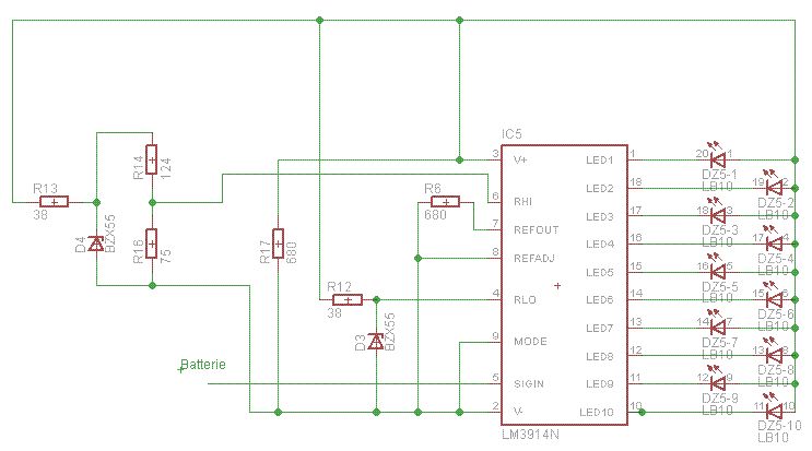 Du schliesst die "Batterie" (also wohl deren + Pol) direkt an SigIn an, dafür Masse der Batterie nirgends ? Gut so, so geht der Chip wenigstens nicht kaputt. Ist es wirklich so schwer, einen der hunderten LM3914 Batteriewächter aus dem Netz einfach abzuzeichnen ? Muß man alle Fehler neu selbst erfinden ? Das spart auch noch jede Menge Bauteile, man braucht keine ungenauen Z-Dioden damit der LM3914 an REFLO und REFHI passende Spannungen bekommt. Dazu ist REFOUT und REFADJ da. http://www.electronicecircuits.com/electronic-circuits/lm3914-12v-battery-monitor-circuit