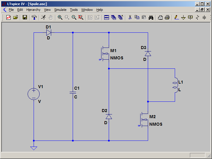 Hallo, hier mal eine Skizze. V1 und D1 stellt das Netzgerät dar; die Diode deshalb, weil dein Netzgerät auch nur Strom ausgeben kann, es kann aber kein Strom ins Netzgerät fließen. Der Elko muss so groß sein, dass beim Abschalten der Transistoren der Spannungsamstieg im Zwischenkreis nicht zu groß ist. Dabei muss die Energie, die in den Spulen gespeichert ist, berücksichtig werden. Die beiden Transistoren werden zusammen angesteuert, also immer gleichzeitig ein und ausgeschaltet. Während die Transistoren an sind, steigt der Strom durch die Spule linear an. Wenn der gewünschte Maximalstrom erreicht ist, werden die Transistoren abgeschaltet und der Strom fließt durch die beiden Dioden in den Elko rein. Dabei polt sich die Spannung an der Spule um und der Strom sinkt wieder linear auf 0 ab.