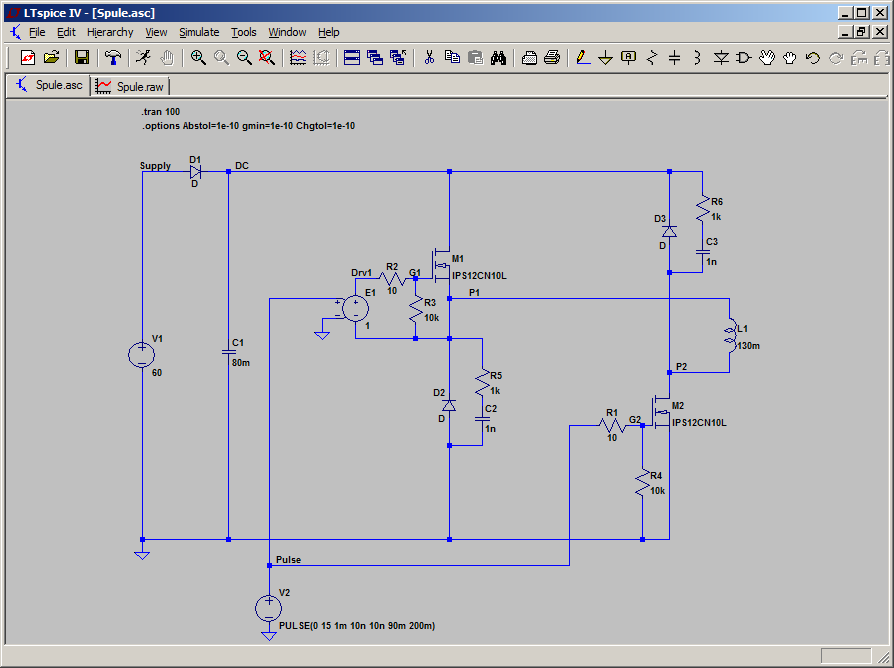 Ich hab auch mal ne Simulation gemacht, mit den Spannungen 60V und 100V. Man sieht, dass die Strom-Anstiegszeit ca. 90 ms beträgt, die Abfallzeit ist gleich groß. Deshalb wirst man mit dieser Spannung und dieser Induktivität nicht viel mehr als 5 Hz erreichen. Damit sich der Strom schneller ändert, brauchst du entweder eine höhere Spannung oder eine kleinere Induktivität. Man könnte theoretisch die Induktivitäten parallel schalten, allerdings ist dann nicht gewährleistet, dass sich der Strom auf alle gleich aufteilt (z.B. durch unterschiedliche EMK, unterschiedliche Luftspalte, ...). Bernd P. schrieb: > Unser Netzteil ist bereits ohne diese Zusatzsschaltung in der Lage, die > erforderliche Leistung zu bringen, Mit einer Ausgangsspannung von 60V kann dein Netzteil niemals einen Strom von 50 A in weniger als 15 ms aufbauen. Wie sind denn am realen Teststand die Spulen verschaltet? Bernd P. schrieb: > Kann ich > schaltungstechnisch das ganze auch ne Nummer kleiner machen, um unser > Netzteil einfach nur zu entlasten oder zu unterstützen? Ich sehe da keine einfache Lösung. Du brauchst zwingend die hohe Spannung, um ein hohes di/dt zu erreichen. Oder du betreibst die Spulen alle einzeln. Dann kannst du den Strom in jeder Spule separat regeln, das ist allerdings ein noch größerer Aufwand.