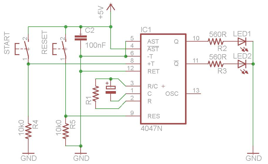 Ich habe heute versucht diese Schaltung mit einem 4047 auzubauen: (Über der Grafik steht: [Quick update - in the schematic below, also connect 4047 pin 14 to +5V]) Aber es will einfach nicht funktionieren... Hat jemand eine Schaltung für irgendeinen IC von der er sicher weiß, dass sie funktioniert (Wenn möglich mit 3V)? Oder kennt jemand eine gute Software, mit der ein Anfänger Schaltungen mit solchen ICs simulieren kann? Die Schaltung verhält sich übrigens sehr merkwürdig, mal wird getriggert, mal nicht, manchmal triggert sie obwohl ich den Taster nicht betätige. Kann es sein, dass eins meiner Teile kaputt ist? Ähnliche Probleme hatte ich schon mit einem NE555.