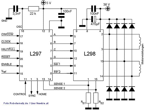 Das hier ist der Schaltplan: http://www.rn-wissen.de/images/7/77/L298standard.gif Ich habe also alles so umgesetzt. Für ein Bild muss ich den Akku meiner Kamera erst laden. Wie fügt man hier ein Bild richtig ein? Solange besser hier der link: http://www.rn-wissen.de/index.php/Schrittmotoren#Schaltung_zum_Ansteuern_eines_Schrittmotors_mit_L298_und_L297