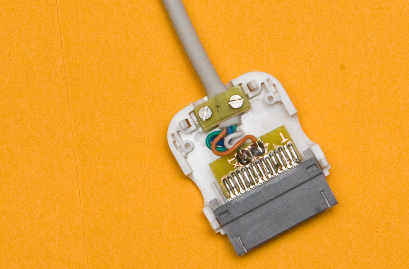 Ja, hast ja Recht. Schön isser nich. Dafür eben praktisch. Es gibt da noch den stylishen http://www.watterott.com/de/iPod-Connector-Male-Style-4 ,aber daran kann man ein paar Drähtchen anlöten und das wars dann auch schon. Eine Zugentlastung erscheint mir schon wichtig, da die Lötfähnchen eng beieinander liegen und auch recht flexibel sind. Wenn dan mal jemand am Kabel rüttelt gibts innen die lustgsten Kurzschlüsse. Hatte dafürextra ne kleine Platine gemacht um die Pins zu fixieren. So etwas passt in den Schönling von Stecker aber eben nicht rein.