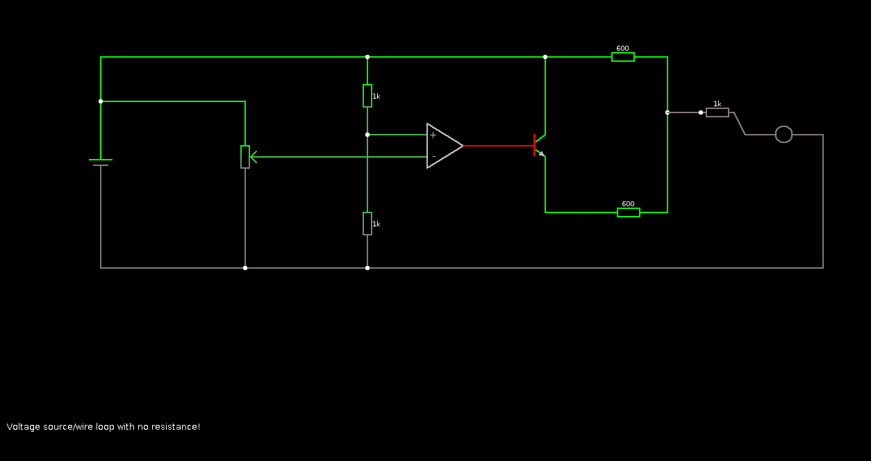 Ich habe es jetzt noch einmal verbessert. Jetzt hat es eine variable Spannungsquelle. Allerdings bekommt man nun eine Convergence failed Fehlermeldung, wenn man die Spannung zu weit absenkt. http://www.falstad.com/circuit/#%24+1+0.0+2.4737822143832555+50+5.0+50%0Ar+400+192+400+320+0+9020.0%0Ar+400+416+400+560+0+10000.0%0Ar+720+192+864+192+0+600.0%0Ar+720+432+864+432+0+600.0%0A162+1184+320+1184+480+1+2.1024259+1.0+0.0+0.0%0Aa+528+352+656+352+1+15.0+-15.0+1000000.0%0A174+304+304+304+432+0+4960.0+0.5+Resistance%0Aw+400+320+400+416+0%0Aw+736+432+672+432+0%0Aw+1024+304+1184+304+0%0Aw+1184+304+1184+320+0%0Aw+1184+480+1184+560+0%0Aw+400+560+1184+560+0%0At+656+352+672+352+0+1+9.300014669542588+9.282685990028588+100.0%0Aw+672+368+672+432+0%0Aw+720+432+736+432+0%0Aw+672+240+672+336+0%0Aw+160+560+304+560+0%0Aw+304+560+400+560+0%0Aw+160+192+304+192+0%0Aw+304+192+304+304+0%0Aw+304+192+400+192+0%0Aw+400+320+496+320+0%0Aw+496+320+496+336+0%0Aw+496+336+528+336+0%0Aw+720+192+672+192+0%0Aw+672+192+672+240+0%0Aw+864+192+864+304+0%0Aw+864+304+864+432+0%0Aw+864+304+896+304+0%0Aw+896+304+1024+304+0%0Aw+320+368+448+368+0%0Aw+448+368+528+368+0%0Aw+448+192+672+192+0%0Aw+304+432+304+448+0%0Aw+304+560+304+528+0%0A172+96+336+96+384+0+6+5.7+6.0+0.0+0.0+0.5+Voltage%0Ag+96+496+96+464+0%0Aw+160+560+96+560+0%0Aw+96+560+96+496+0%0Aw+96+336+96+192+0%0Aw+96+192+160+192+0%0Aw+400+192+448+192+0%0Aw+304+448+304+528+0%0Ao+4+64+0+39+20.0+0.025+0+-1%0Ao+31+64+0+35+20.0+9.765625E-5+1+-1%0A