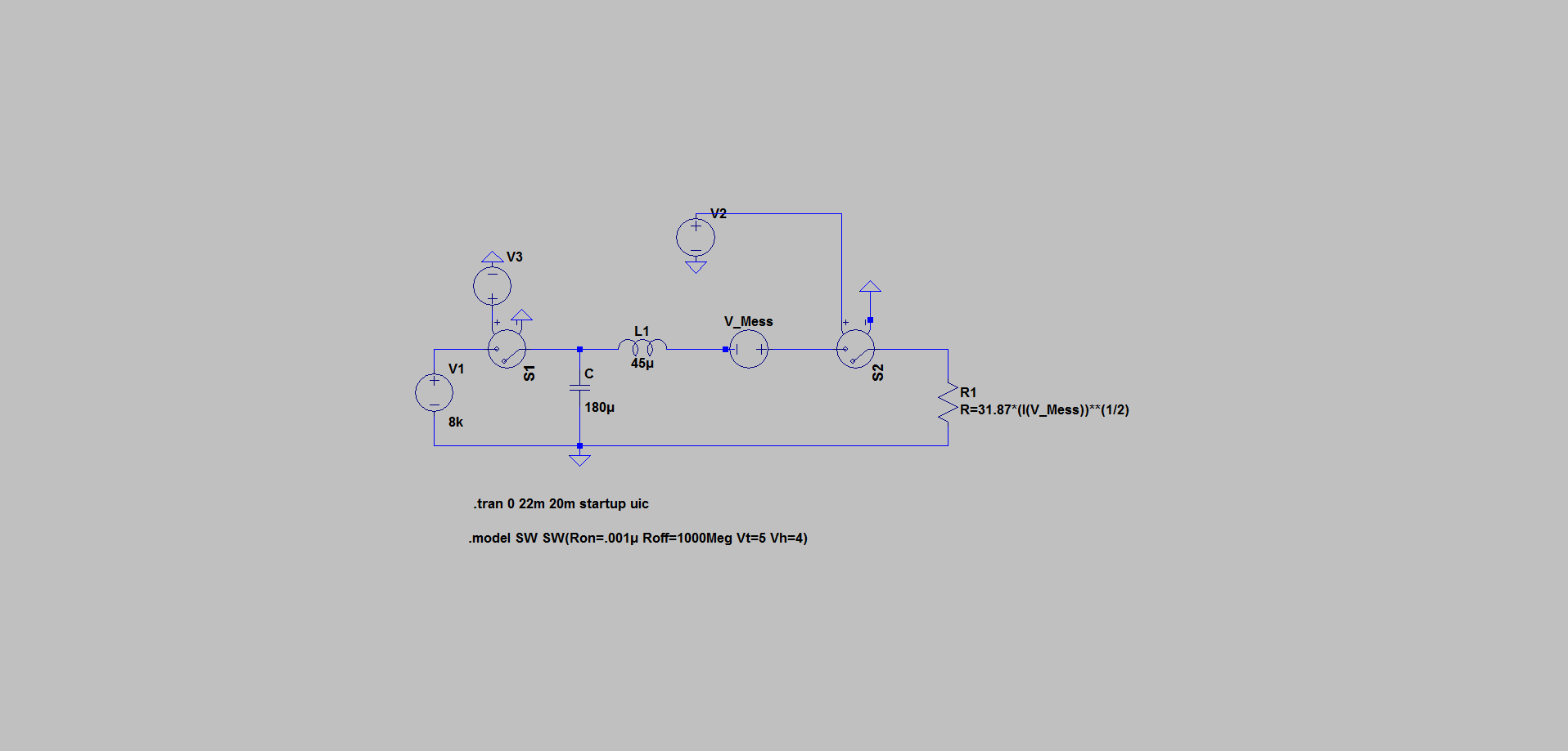 Hallo, ich hab ein kleines Problem mit meiner Simulation. Kurz zur Erklärung: ein Kondensator(C1) soll über eine Gleichspannungsquelle (V1) auf eine definierte Spannung aufgeladen werden, um einen hochenergetischen Puls zum kurzzeitigen Betrieb eines Lichtbogens (R1) bereitzustellen. Der Widerstand des Lichtbogens hängt von der Stromdichte ab. Um dies darzustellen, nutze ich die Spannungsquelle V_Mess (=0V) als Strommesser, der Widerstandswert von R1 berechnet sich dann zu R1=x*I^(1/2) (x=const). Beim Starten der Simulation bekomme ich die Fehlermeldung: Analysis: Time step too small; initial timepoint: trouble with node "n004" Der Knoten n004 ist der Knoten zwischen Kondensator, Spule und S1 Eine manuelle Wahl der time steps hat nichts gebracht, ebenso wenig das Verbinden aller Knoten über hochohmige Widerstände mit Masse. Vielen Dank schon mal im Voraus für die Hilfe! Gruß Steve