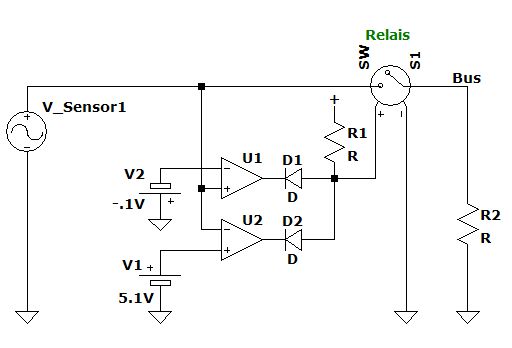 Ich denke, dass die Fragen von Mawin schon im Anfangspost beantwortet sind: Ob es digital oder analog ist ist prinzipiell egal. Beide Sensorarten würden verfälscht wenn eine Spannung an den Bus angeschlossen wird. Da es sich um eine Sensorleitung handelt kann man von nicht nennenswerten Strömen ausgehen (max 10mA). Vorwiderstand und Schutzdiode(n) verhindern eine Zerstörung der angeschlossenen Komponenten, aber keine VERFÄLSCHUNG des Signals. Um welchen Bus es sich handelt ist glaube ich auch nicht relevant bzw. es ist kein standartisierter Bus. Er hat nur eine Signalquelle (Temperatursensor etc.) und mehrere Anschlusspunkte, an denen das Signal über eine anschlussklemme abgegriffen werden kann. Es muss also verhindert werden, dass durch anschließen einer Spannung an diese Punkte die Signalspannung am Bus verfälscht wird. Also eine Seriendiode, aber halt ohne Spannungsabfall, damit an den Anschlusspunkten im Normalfall das unverfälschte Signal anliegt.