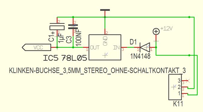 - Probiers mal mit ZWEI Kondensatoren (Am Eingang fehlt wohl auch einer) - Klinkenstecker für Stromversorgung ist eine schlechte Idee (Kurzschluss beim Stecken oder abgezogen gefährlich) - Kann man in Target auch richtig rum zeichnen?