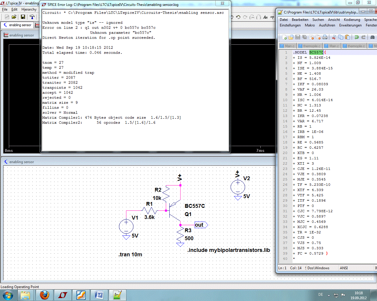 Hi ich versuche die ganze Zeit den BC557C einzubinden. Ich habe mir ein spice model aus dem Internet kopiert (siehe Bild) Da ich in Zukunft sicher mehrere Transistoren benutze habe ich eine allgemeine mybipolartransistors.lib erstellt und dort das spice model vom BC557C kopiert. In Ltspice anschließend nen pnp aus der Bibliothek geholt und den Namen in BC557C umbenannt. Danach über die spice directive die erstellte lib eingebunden, die Schaltung und die Bibliothek befinden sich in dem gleichen Ordner. Kriege folgende Fehlermeldung beim simulieren, was habe ich falsch gemacht? (siehe ltprob.gif)