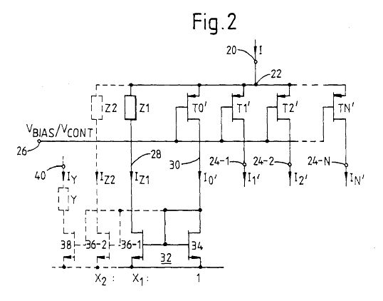 Helmut S. schrieb: > Mit N gleich großen Transistoren geht das nur dann, wenn man entweder > überall genau 1/N Aufteilung haben will das ist exakt was ich benötige.... es handelt sich um eine spezielle geometrische elektrodenanordnung, bei der gewährleistet sein muss, dass jedes areal unterm strich die exakt gleiche elektrizitätsmenge erhielt. stell dir z.b. ein quadrat mit 7cm kantenlänge vor, an den ecken und in der mitte jeweils eine ringelektrode, die in der mitte sei die kathode. der spezielle signalstrom soll jetzt geteilt werden auf die 4 aussenelektroden. > oder man muss an einer Stelle > mehrere parallel schalten, wenn man M/N haben will. Das Bild im Patent > ist mehr als nur eine Prinzipschaltung sondern schon gleich eine > praktikable Möglichkeit der Realisierung über das Verhältnis W/L. Dabei > macht man bei allen Mosfets die Breite L gleich und stellt über die > Länge W des Gates das Verhältnis W/L ein. das bild ist für den fachfremden jetzt weniger leicht zu verstehen... alles rechts von T0', also T1',T2' etc. ist uninteressant da es sich auf das teilen bei gleicher impedanz handelt... eben ein 'einfacher' stromspiegel ist nach fig.1 (prior art) mich hat also nur der linke teil davon, also current mirror circuit 32, zu interessieren... wobei ich dann aber sogleich feststellen muss, dass obige elektrodenplazierung damit gar nicht möglich ist... da die variable impedanz zwischen punkt 22 und source des mosfets liegt.... ich nun aber, wollte ich die 4 teilströme mit einer kathode aufnehmen, an den ausgang(drain) von z.b. 36-1 bis 36-4 die elektroden hängen müßte... was bestimmt nicht zulässig ist... korrekt?????