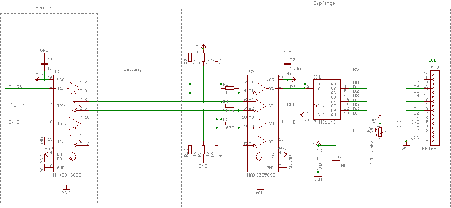 So kannst Du Dein Problem ohne Controller lösen. Du siehst hier das Sende-IC, das die Einzelsignale in differentielle Signalpaare umsetzt, und auf der anderen Seite das Empfangs-IC, das die Spannungsdifferenzen der Adernpaare misst und wieder in Einzelsignale umwandelt. Die Widerstände vor dem Empfangs-IC sorgen dafür, dass die Signalenergie vollständig aufgenommen wird und nichts zum Sender wieder zurückkommt. Ich habe hier ICs von Maxim eingezeichnet, es gibt aber noch andere Möglichkeiten. Reichelt hat meist ältere Sachen wie 26C31/26C32 oder so, die zwar mehr Strom brauchen, aber für Dich trotzdem gehen. Datenblatt vorher lesen und verstehen! Weil Du bei einem normalen Display ziemlich viele Leitungen brauchst, habe ich hier mit einem Schieberegister etwas getrickst. Du taktest über RS und CLK Deine 8 Datenbits ins Schieberegister rein. Anschließend setzt Du RS auf den Wert des RS-Bits, ohne anschließend die CLK-Leitung zu betätigen, und sendest dann einen Puls auf der E-Leitung, womit das Display das Datenwort im Schieberegister und das RS-Bit auf der Datenleitung übernimmt. Du kannst so nur schreiben und nicht lesen, aber das brauchst Du normal auch nicht. So kommst Du insgesamt nur mit drei Adernpaaren aus - plus Masse, die brauchst Du immer. Da Du vermutlich noch Adern frei hast, ist es nicht verkehrt, mehrere Adern als Ground zu verwenden. Normalerweise sollten die Adernpaare verdrillt sein, aber das Kabel wirst Du jetzt wohl nicht mehr wechseln können. fchk