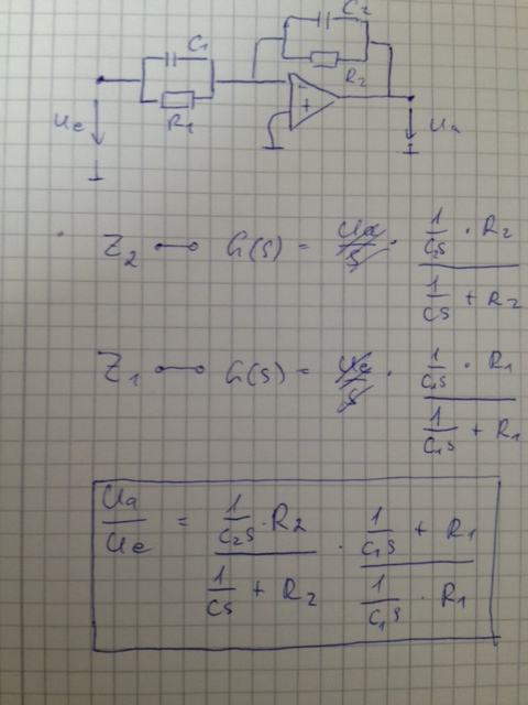 Ich vermisse noch ein (-)-Zeichen. Es muss doch heißen: Ua/Ue = - Z2/Z1 Wir haben einen invertierenden Verstärker vor uns ...