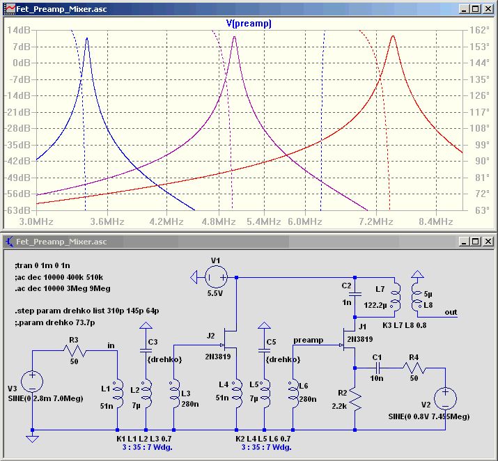 Der Preselektor bringt, so wie er bei meinem Mischer-Vorschlag aufgebaut ist, eine "kostenlose" Verstärkung von > 10 dB. Von der Koppelwicklung zum Schwingkreis wird hochtransformiert und der Fet belastet den Schwingkreis kaum. Mehr würde ich hier auch nicht verstärken, denn das würde die Großsignalfestigkeit unnötig verschlechtern. Für den Preselektor bieten 2 gekoppelte Schwingkreise als Bandfilter bessere Eigenschaften, als zwei einzelne Schwingkreise mit Verstärker dazwischen. Jedoch muß auf die Kopplung über diesen weiten Bereich von 3,5 bis ca. 7,4 MHz geachtet werden. > dass die Vorstufe als selektiver Verstärker ausgeführt wird? Entweder nach einer Schaltung suchen, welche die Kopplung über einen großen Bereich konstant hält, oder doch einen Puffer-Verstärker als Source-Folger dazwischen, welcher die Kopplung verhindert. Dann ein Schwingkreis davor und einer dahinter. Es sieht so aus, als sollte man mit an die Schwingkreis angepassten Koppelwicklungen arbeiten. > mit knapp über 5V In der Simulation wird das Signal mit 5,5V kaum schlechter