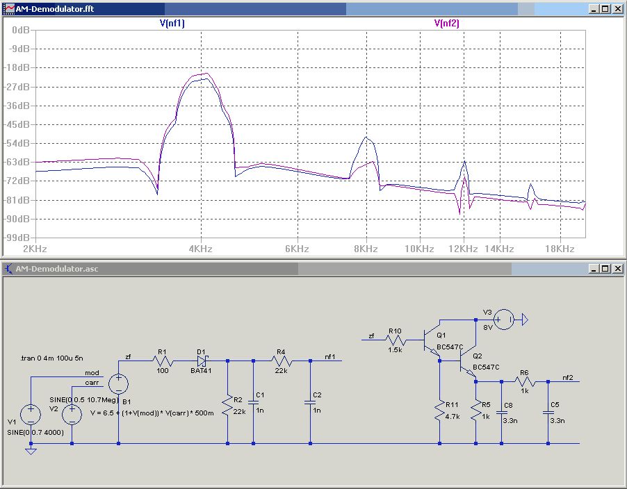 Hallo Sven Wenn die beiden JFets beim Produktdetektor getauscht werden, funktioniert die Schaltung besser und es reduziert deutlich die Verzerrungen. Dann hab ich erste Simulationen mit der AGC durchgeführt. Nach wie vor gibt es den Nachteil der negativen Regelspannung. Optimalerweise müßte ein PI-Regler rein, damit die Regelabweichung gegen Null geht. Die AGC-Spannung verhält sich einigermaßen proportional zur Signalstärke, wenn auch nicht linear. Der Diodengleichrichter könnte auch einen Pufferverstärker vertragen, da er den Schwingkreis deutlich belastet. > dass der Ausgangswiderstand viel höher als bei Bipos ist. Je nach Arbeitspunkt können die Bipolartransistoren am Kollektor auch ziemlich hochohmig werden. Das Verhalten ist doch Ic = Ib*hFe. Der Kollektor verhält sich also mehr oder weniger wie eine Stromsenke gesteuert vom Basisstrom. Ideale Stromquellen/Senken haben aber einen unendlichen großen Innenwiderstand. > Von einem FET Zf-Verstärker verspreche ich mir weniger > (Verstärker-)Rauschen, oder kann man das so pauschal nicht sagen? Nein, kann man nicht. Aber sie belasten den Schwingkreis recht wenig. Für Bipolar wären dafür Koppelwicklungen notwendig.