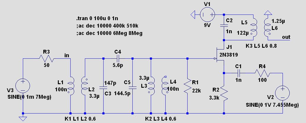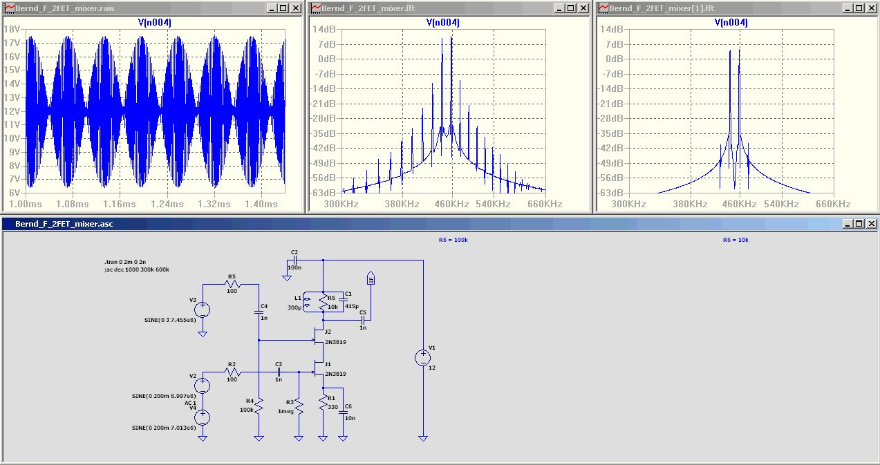 So habe mal einen 2-FET-Mixer simuliert. Der Sinus sieht allerdings merkwürdig aus. In der Realität muss in den Schwingkreis ein R damit der Mischer nicht schwingt - oder ein Schwingkreis mit geringer Güte.