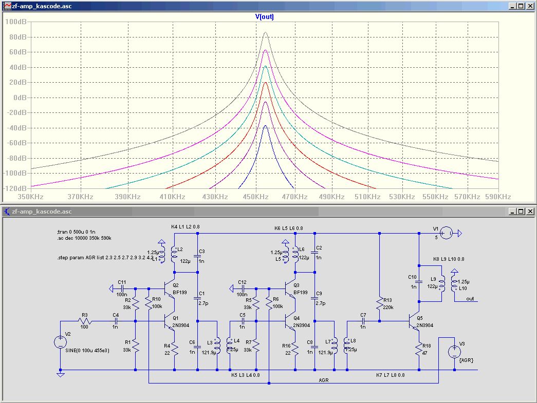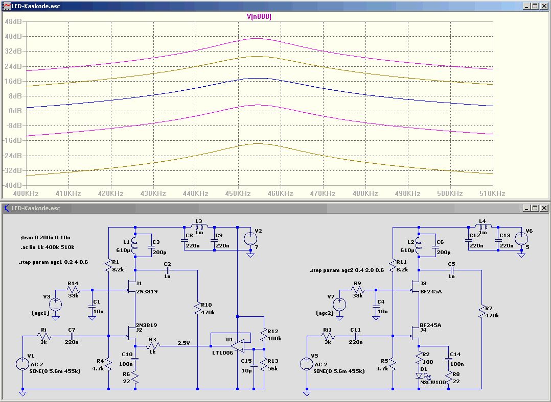 Hallo Sven Ich hab mal auf die Schnelle einen modifizierten asc-file angehängt. > eine Option auf AGC halte ich mir auch noch offen Schau Dir mal die beiden Links an, speziell bezüglich Kaskoden-Verstärker. Dieser läßt sich ziemlich gut regeln und hat auch pro Stufe bis zu 40dB Verstärkung. Der Ausgangswiderstand ist sehr hochohmig, dadurch wird der Schwingkreis kaum bedämpft. http://www.qrp.pops.net/cascode_bjt.asp http://homepage.tinet.ie/~ei9gq/80M_.html