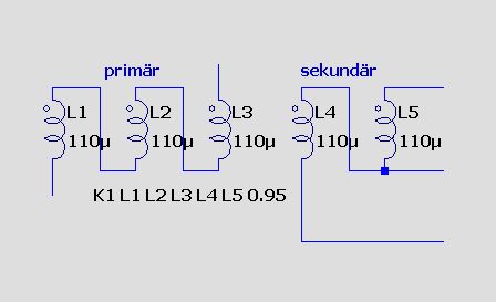 Gestern Abend hatte ich diese Schaltung mal ausprobiert, und komischerweise funktioniert sie, im Gegensatz zur Simulation, scheinbar ganz gut. Im Gegensatz zum Schaltplan hab ich aber in der Realität auch an der Eingangsspule induktiv eingekoppelt, ca 6:35 Windungen.
