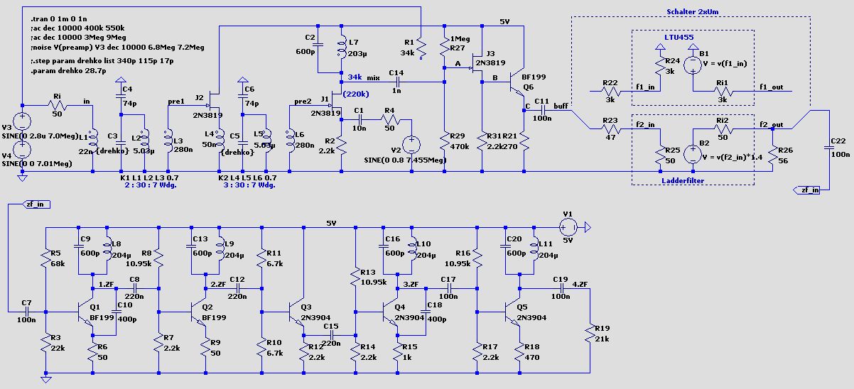 Nun, die Trennschärfe ist mit dem Super natürlich um Längen besser^^. Man muss sicher bei manchen Sendern die ZF-Verstärkung zurückdrehen, aber eine Option auf AGC halte ich mir auch noch offen. Das mit der Transformation am Eingang war mir bewusst, habe ich so auch bei meinem anderen Empfänger schon angewendet. Ich frage mich nur wie man so etwas rein mit Transistoren hinbekommen könnte. Vielleicht in Richtung Basis/Gateschaltung als Eingangsstufe? Die asc Datei hab ich gerade erst gesehen, werd ich mir morgen genauer Ansehen. Ich hab mal die Datei von meinem ZF-Amp angehängt, würde mich mal interessieren was Du davon hältst. Da gibts sicher vieles zu verbessern. Aber bevor die Frage aufkommt, warum da 2n3704 drin sind: Ich hatte einfach keine anderen mehr^^. Daher hab ich die beiden BF199 nach ganz vorne gepackt, da ich mal gelernt habe man soll die Verstärker mit der besten Rauschzahl ganz nach vorne packen. Die 400pF zwischen Emitter/Kollektor sind drin um Eigenschwingungen zu unterbinden, da gegenkoppeln am Emitter teilweise nicht gereicht hat.
