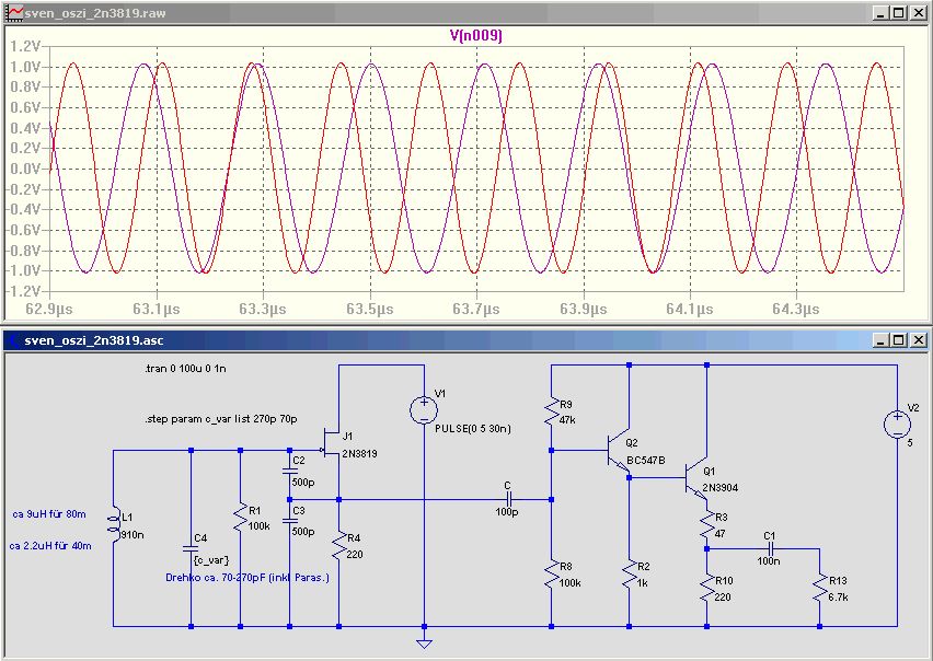 Ein ganz großes Dankeschön dafür! 2 Fragen die mir gerade beim Schaltbild schon in den Sinn kommen: Hat das niedrige L/C-Verhältnis im Drain Zweig einen Grund? Welche Vorteile bringt mir die induktive Auskopplung gegenüber der kapazitiven? Ich hätte noch etwas mehr zu meinem Konzept, wenn man das Chaos so nennen möchte^^, schreiben sollen: Geplant hatte ich einen Einfach-Super in diskreter Bauweise (bis auf den NF-Teil) für das 80m und 40m Band (Momentan läuft der VFO in einem anderen Bereich, da ich zum testen AM-Stationen brauche.). Am Ende soll der Empfänger noch über eine HF-Vorstufe mit Preselektor und einen SSB-Demodulator verfügen. Für die 455khz ZF habe ich mich entschieden, da ich passende Filter noch in der Kiste hatte. Der Bau an sich gestaltet sich aber ohne Messmittel recht schwierig. So kann ich zb nur Vermutungen über den Ausgangspegel von meinem VFO anstellen, da die Werte aus der Simulation so nicht stimmen können. Daher ist das Ganze auch zu einem großen Teil eine blinde Versuch und Irrtum Methode. Erfahrungen in HF habe ich lediglich durch einen Geradeaus-Zweikreiser den ich Anfang des Jahres gebaut hatte. Immerhin empfange ich damit Amateurfunk aus den USA^^.