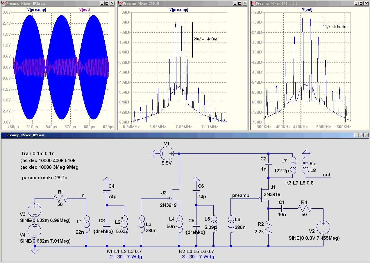 Hallo B e r n d F. Schau Dir mal die Kreuzmodulation an. Als einzigen Unterschied habe ich R6 von 100k auf 10k verkleinert. Das Signal vor dem Roofing-Filter solte so klein bleiben, wie man es bezüglich des Rauschens gerade noch verschmerzen kann. Bei einem guten, großsignalfesten Mischer sieht man außer den beiden "richtigen" Signalen gar nichts.
