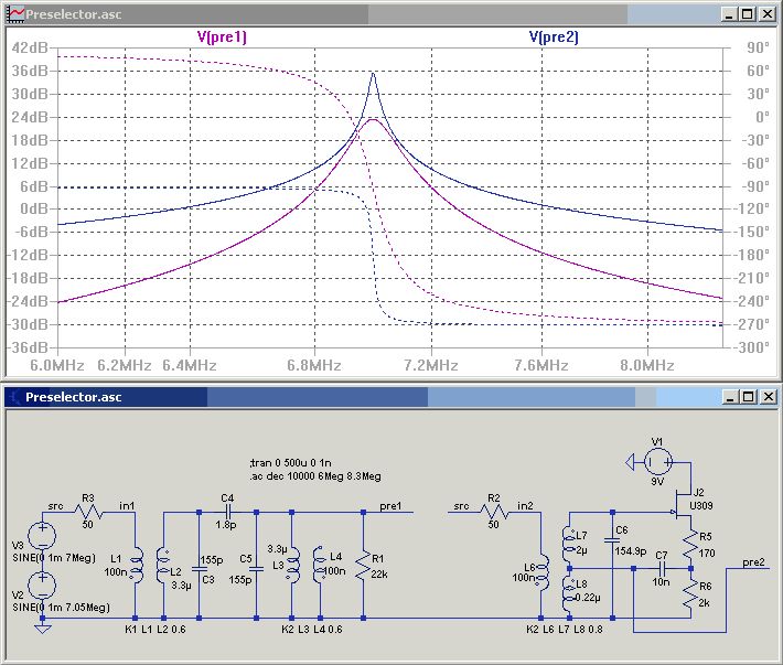 > der Übertrager den ich verwende kommt mir noch komisch vor Mir auch. Den Besten Koppelfaktor erhält man durch Verdrillen, den zweitbesten durch Verschachteln der Wicklungen. Also in diesem Fall die Sekundärwicklung obendrauf. > einen FET als Mischer, Schau mal da (Schematic 4): > http://www.qrp.pops.net/cascoder1.asp Ich hab diese Schaltung nochmal aufgegriffen. In der Simulation im Anhang funtioniert das ziemlich gut. Außerdem würde der Kern wegfallen. >> http://www.qrpproject.de/DL4YHFcounter.html > Würde 35€ kosten. Bei den LEDs ist der Stromverbrauch relativ hoch. Ich würde da einen Frequenzzähler wie diesen vorziehen: http://www.sprut.de/electronic/pic/projekte/frequenz/freq.htm Der hat wesentlich mehr Stellen. Für einen Kurzwellen-Receiver sollte die Auflösung wenigstens 100Hz betragen. Das Material kostet ~10Euro. Aufbau auf Lochraster an einem Abend. Allerdings sollte die Ablage umschaltbar sein zwischen -445, -455, 448 und 455 kHz. Da müßte man genau sowas finden, offenen Quellcode modifizieren oder selbermachen. Eventuell gab es das auch hier im Forum schon mal. Auch noch was: Bucht# 160897290785