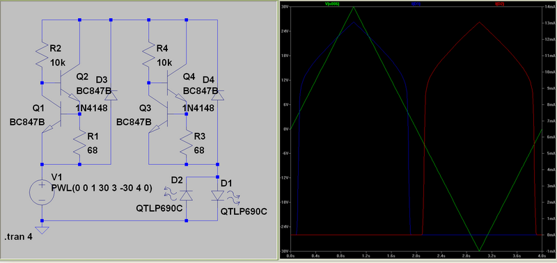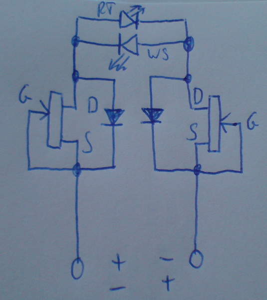 Zwei KSQ antiseriell, die jeweils mit einer parallelen Diode gebrückt werden. Die rote LED ist die Schutzdiode für die Weisse. Spricht aber nichts dagegen, die bei Einhaltung der Parameter mitzunutzen. Fahrtrichtungsabhängige Beleuchtung bei Modellbahnlok?