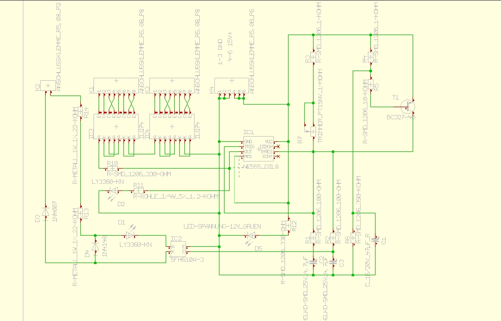 Aufgrund der "hohen Resonanz" nochmal eine Frage: Die Schaltung im unteren Bild scheint korrekt zu sein, muß nur nochmal die Widerstände nachrechnen. Die 230V-Geschichte oben macht mir halt mehr Gedanken, eben wegen des 100Ohm Widerstandes. Der Transistor soll ja EIN/AUS schalten und nicht linear regeln. Eigentlich soll ja nur ein Schalter emuliert werden, der normalerweise an dieser Stelle sitzt. Relais möchte ich keines nehmen, der Geräusche wegen und des Platzbedarfs auf der Platine halber. Außerdem ist doch so'en Optokoppler irgendwie eleganter, nich'? Deswegen, wer Zeit hat und Ahnung einfach mal meine Schaltung checken, damit ich sie fertigstellen kann, die Platinen sollen nämlich zum Leiterplatten-Fuzzi! Gruß, Andreas