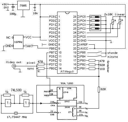 GEISTESBLITZ +++++++++++++++++++++++++++++++ Ich glaube ich weiss nun wie wir das mit der FARBE hin bekommen könnten. Zuerst bauen wir uns ein Quarzoszilator mit den berühmten 4,4....MHz (aus alten TV ausbauen) Diesen werden wir dann über einen Port vom Atmel entweder zuschalten oder auch nicht. Und da 16MHz überhaupt nicht durch 4,4 teilbar sind müssten wir schöne farbverschiebungen hin bekommen. leider weiss ich nun im Vorraus nicht welche farben da entstehen, jedoch irgendwie BUNT wird es schon werden (glaube ich). also benötigen wir als zusätzl. Hardware ein Quarz (4,4...MHz) ein NAND Gatter (74xx00) als Generator und ein Wiederstand. Möge mich jetzt noch einer schnell berichtigen ansonsten baue ich den scheiss gleich mal.....