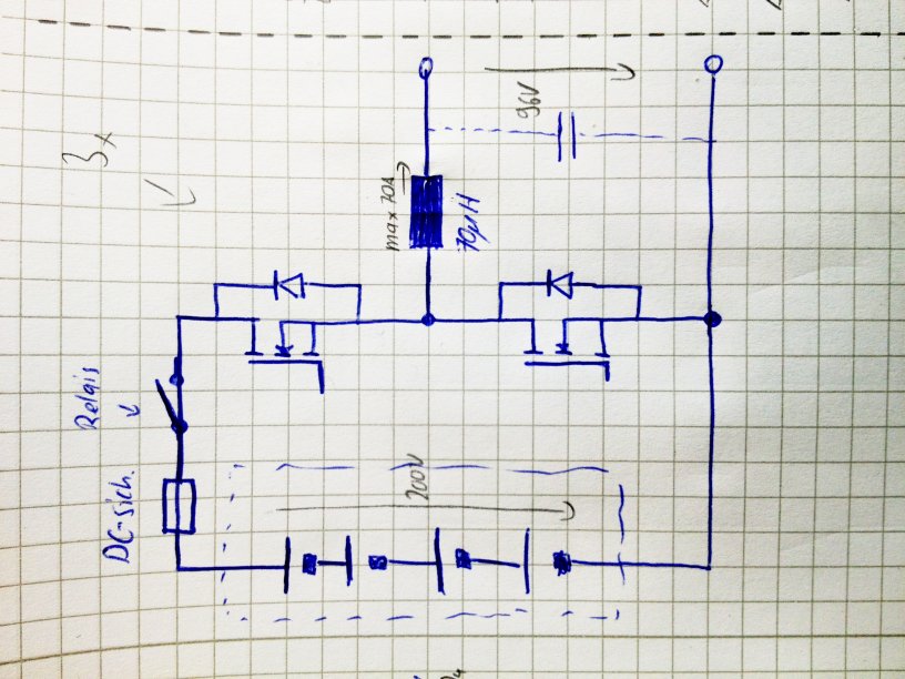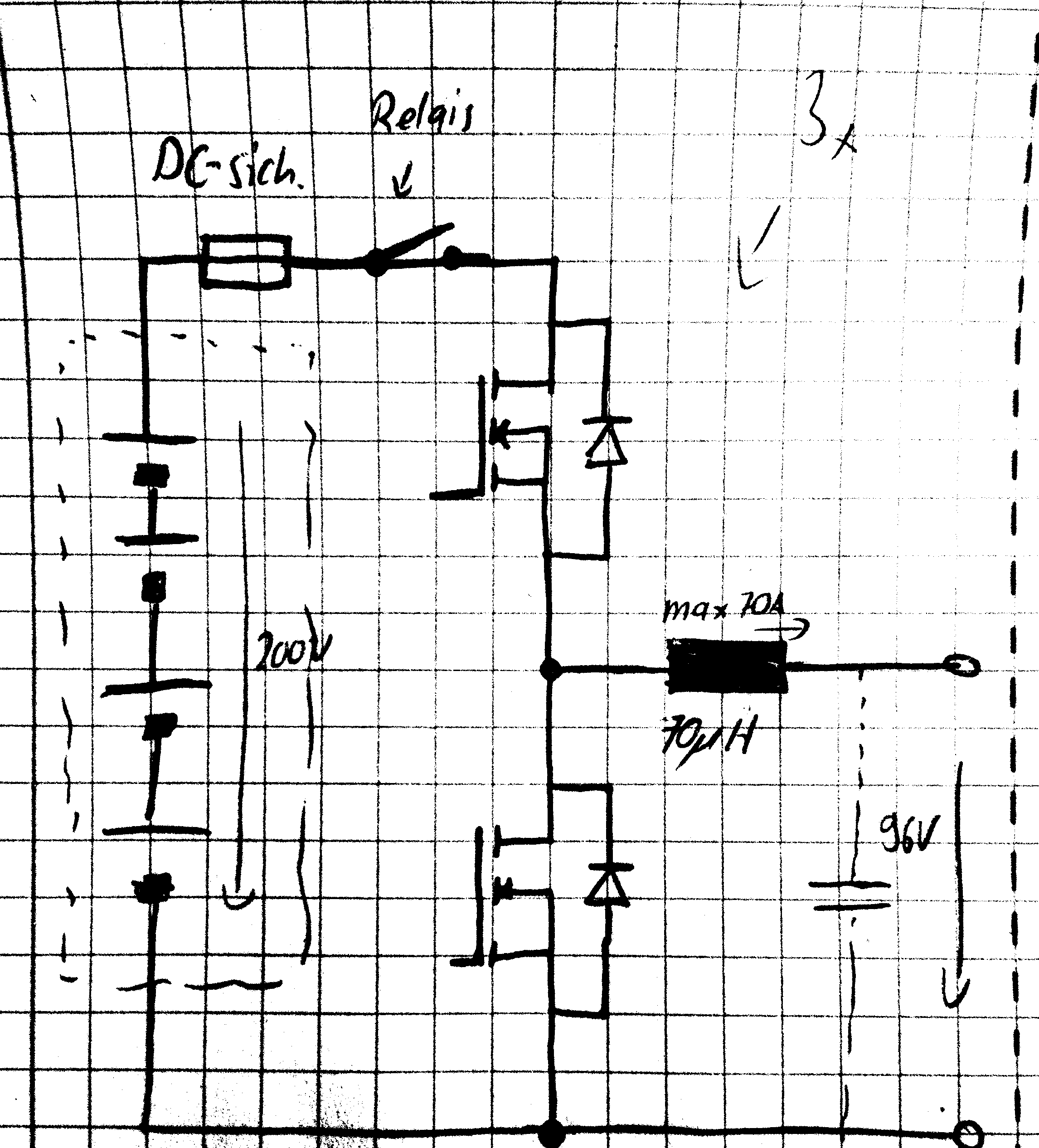 Der Umrichter ist bereits vorhanden, aus einem alten E-Fahrzeug und der läuft mit 96V eingangsseitig Die Schaltung an sich ist ein 2Q Steller, meine Aufgabe ist es jedoch lediglich Den Leistungsfluss in eine Richtung (von Akku zum Umrichter) zu realisieren.
