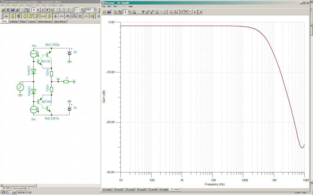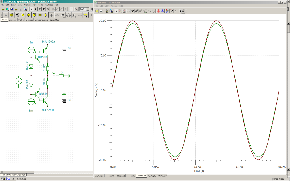 > Derzeit bin ich jedoch noch an der Vorstufe, die sich nur mit positiven > Spannungen befasst. > Habt ihr eine gute Idee mit welchen Bauelementen ich hier weiterkomme? So wird das nichts. Du hast ein symmetrisches Signal an Ein- und Ausgang mit großem Strom, also brauchst du auch eine symmetrische Schaltung (Gegentaktschaltung). Es gibt da Power-OPVs PA12, PA51,... aber die schaffen die Bandbreite nicht. Falls es nicht allzu genau sein muss, geht eine diskrete komplementäre Sziklay-Schaltung mit Vorspannung und Ansteuerung in der Mitte. Ich hab dir mal sowas angehängt. Bandbreite ist wie gewünscht, allerdings werden die Endstufentransistoren bei deinen Forderungen überlastet, also Parallelschaltung. Gleichstromtransistoren wie 2N2955/3055 und ähnlicher Müll gehen nicht!