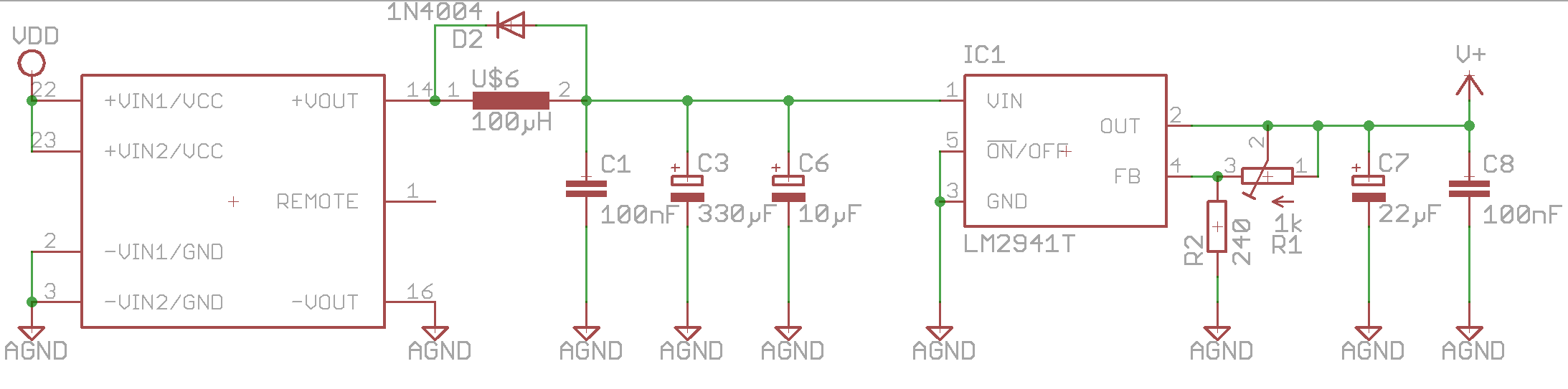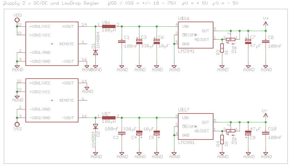 Danke für die Antworten, ich hab den Schaltplan wie folgt abgeändert. Bitte nicht wundern, R1/R2 sowie C7 und die jeweils negativen Pendanten wurden geändert, das hat aber nichts mit der Frage hier zu tun. Es handelt sich ganz allgemein um eine Schaltung die aus +/- 60V eine absolut saubere +/- 5V Gleichspannung erzeugt. Den "Remote" Pin am DC/DC Wandler muss man unbeschaltet lassen, deshalb ist der nicht angeschlossen. Dioden D1 und D2 nun so korrekt? Sollte ich andere Dioden verwenden oder sind die 1N400x ok? Die Wandler sind für knapp 700mA ausgelegt, mehr fließt dort auch nicht. Ich denke im normalen Betrieb werden nie mehr als 150mA je Spannung gezogen. Danke, Gruß