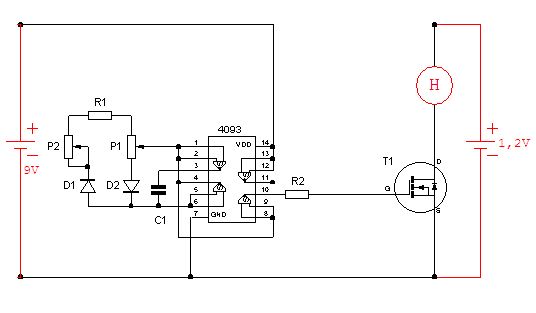 Heizelement schrieb: > Die Lösung mit dem MOSFET habe ich leider nicht wirklich verstanden - > sorry. Wie müsste ich den denn verschalten? Man könnte (für PWM) einen MOSFET an einen 555 hängen. Dazu braucht es aber eine zweite Spannung, so 5-12V. Hast du sowas oder hast du nur die 1,2V?