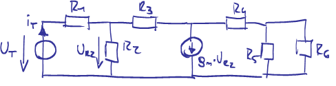 Hi, Ich bin schon entsetzlich am Verzweifeln bei einer Trivialaufgabe! Ich möchte den Innenwiderstand der angehängten Schaltung (Verstärker Ersatzschaltbild) berechnen. R6 ist dabei die Last und die Spannung an R2 wird zu einem Strom verstärkt. Ich wähle nun die Testspannung U_T, messe den Teststrom i_T und berechne "einfach" R_in = U_T/i_T. Ich schaffs einfach nicht dass nur die Werte der Widerstände sowie g_m übrig bleibt. Gibts doch nicht! :-( Kann mir wer helfen? Danke! LG Peter