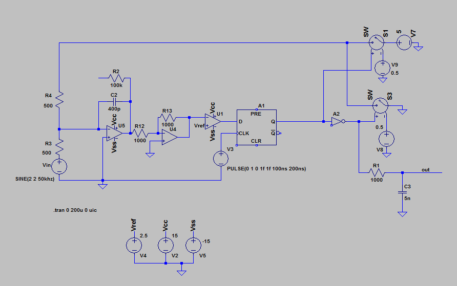 Andy schrieb: > Was haltet ihr den generell von meinen Überlegungen bezüglich der > Zeitkonstante des Integrators? Andy schrieb: > Periodendauer der Überabtastfrequenz: T=200ns > Tau = R*C >= T = 200ns > > Mit R = 500Ohm -> C= 400pF Du musst mit R = R1||R2 = 250Ω rechnen. Das ergibt dann C=800pF. Die Anstiegsgeschwindigkeit und die maximale Amplitude des Ausgangssignals des Integrierers sind - umgekehrt proportional zur Zeitkonstante des Integrierers - proportional zur Taktperiodendauer - proportional zur Eingangsamplitude Wählt man — wie du es getan hast — die Zeitkonstante des Integrierers gleich der Taktperiodendauer, ist die maximale Ausgangsamplitude des Integrierers gleich der maximalen Eingangsamplitude. Man dies als Ziel sehen, muss es aber nicht. Eine kleine Zeitkonstante erfordert eine hohe Slewrate und eine hohe Versorgungsspannung von U5 und U4. Wenn man also keine superschnellen Opamps einsetzen will, wählt man die Zeitkonstante besser etwas nied- riger. Die Zeitkonstante darf aber nicht beliebig groß gewählt werden, weil sonst das Ausgangssignal des Integrierers zu klein und die Schaltung zu rauschempfindlich wird. Die "optimale" Zeitkonstante ist also — wie so oft — ein Kompromiss. Ich würde deswegen die Schaltung erst einmal mit einer (bspw. um den Faktor 10) größeren Zeitkonstante dimensionieren und dabei die erforderliche Bandbreite des Opamps so bestimmen, das die gewünschte Genauigkeit erreicht wird. Das kannst du ganz gut in der Simulation tun. Dann suchst du dir einen günstigen Opamp mit eben dieser Bandbreite aus und ermittelst die Zeitkonstante des Integrierers so, dass die maximale Anstiegsgeschwindigkeit des Ausgangssignals noch deutlich unterhalb der für diesen Opamp spezifizierten Slewrate liegt. Noch ein paar Bemerkungen: Den Invertierer U4 kannst du weglassen, wenn du die Eingänge von U1 vertauschst oder vom Flipflop den Ausgang /Q statt Q benutzt. Für U3 solltest du keinen Opamp, sondern einen schnellen Komparator nehmen. Außerdem solltest du ihm eine kleine Hysterese verpassen, damit er auch bei langsamer Änderung des Eingangssignal ein sauberes Digital- signal liefert. Evtl. bietet es sich an, die Schaltung so auszulegen, dass man auch für die Versorgung des Opamps und des Komparators mit 5V/GND auskommt, so dass die ±15V entfallen können. Aber vielleicht sind die ja ohnehin vorhanden, dann kann man sie natürlich auch nutzen.