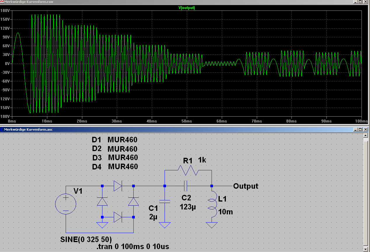 Hallo allerseits, ich war gerade dabei, ein Netzteil zu entwerfen. Dabei habe ich mit einer LT-Spice-Simulation geprüft, ob eine Drossel im Stromkreis was bringt, wie größerer Stromflußwinkel bzw. Sinusförmiger Stromfluß. Hat aber nicht wirklich was gebracht... Dabei hatte ich dann schon einige sehr merkwürdige Kurvenformen. Da habe ich mir gedacht, wenn deine Schaltung schon nicht als Netzteil taugt, dann modifizier sie doch, das sie merkwürdige Kurvenformen erzeugt... Nein, mir ist nicht langweilig, nur mal so. Wenn man den Brückengleichrichter als ein Bauteil zählt, dann sind es einschließlich der Sinusquelle 6 Bauteile. Da könnte man doch eine Art Wettbewerb drauss machen, wer kriegt mit am wenigsten Bauteilen die merkwürdigste Kurvenform hin?! Mikrocontroller und programmierbare Logik sollten nicht erlaubt sein als Bauteil.