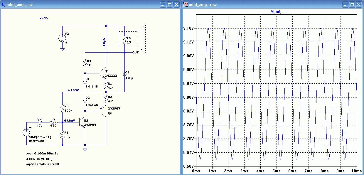 Hallo Kenner, hab die Schaltung mal etwas verbessert. http://www.youtube.com/watch?feature=player_embedded&v=-fIpj2eHL0k Im Anhang sind die Dateien für LTspice. Das funktioniert aber bestimmt auch in QUCS. In meiner Schaltung ist die Verstärkung ungefähr 50. Das hängt aber vom Innenwiderstand deiner Quelle ab. Der Klirrfaktor ist bei mir 2,5% (.FOUR). Verstärkung = delta_Uout/delta_Uin