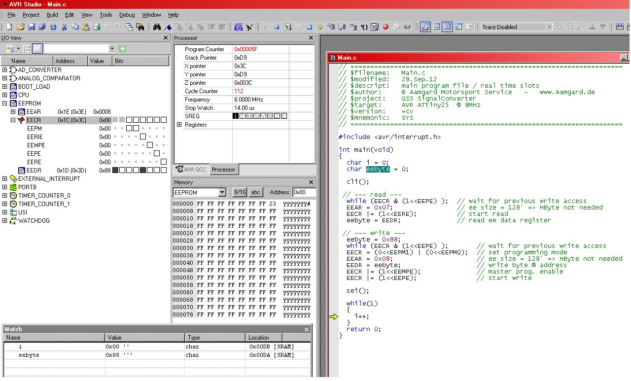 Atmel zum Thema Eeprom sein. Dann damit die Funktion des Eeproms