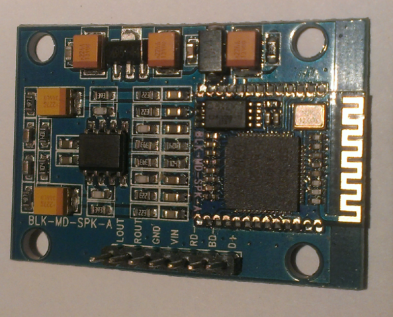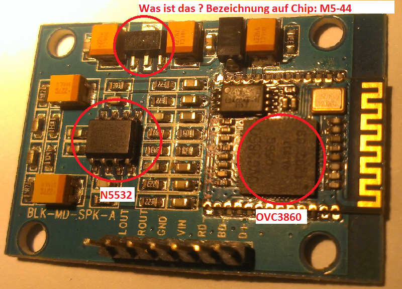 Hallo Ich habe Das Modul inzwischen Bestellt und vor drei Tagen erhalten. Ich habe mich ein wenig erschrocken, als ich das Ding ausgepackt habe. Winzigklein, dachte die Platine sei um einiges Grösser. Natürlich sofort ausprobieren! Da ich im weiter oben erwähnten Datenblatt etwas von 1.8 - 3.5 Volt gelesen habe habe ich zuerst einmal 3 Volt auf das Modul gegeben. Nichts! Anschliessend habe ich folgende Seite gefunden: http://www.elecfreaks.com/wiki/index.php?title=Audio_Bluetooth_Speaker_Module(OVC3860) Hier steht wieder etwas von 4.5 - 10 Volt. Was denn jetzt ? Gibt es eine möglichkeit dies herauszufinden ? Das Modul läuft momentan mit 6 Volt Problemlos ! Musikqualität 1A! Auf dem einem Bild habe ich ein vierbeiniges SMD-Bauteil markiert. Könnte dies ein Spannungsregler sein ? Unter der aufgedruckten Bezeichnung finde ich leider nur sehr wenig. Der Chip ist so winzig dass es mir mit meinen Mitteln nicht möglich ist, ein Pin einzeln anzuzapfen. Bei den Ausgängen auf dem Board mit der Bezeichnung "RD-, BD- und D+" kommt leider nur ein geblinke an, je nach Zustand ob verbunden oder nicht mit einer anderen Frequenz. Was wäre nun die einfachste Lösung um von 3.5mm Klinke auf das Modul umzuschalten ? MfG Manuel