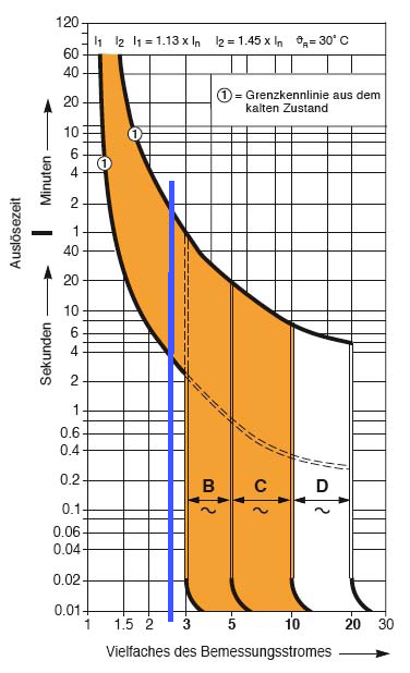 Stimmt, mein Fehler, das kommt davon wenn man hudelt und nicht bei der Sache ist. (Und als Erklärung auch nicht hilfreich, "links von I/In=3 und 2s"). 40A Einschaltstrom ist das 2.5 fache des Bemessungsstromes des Leitungsschutzschalters (40A/16A=2.5) Bei I/In=2.5 wirkt der magnetische Auslöser nicht mehr, thermisch wird frühestens nach etwas weniger als 4s ausgelöst, sollte also immer noch funktionieren.