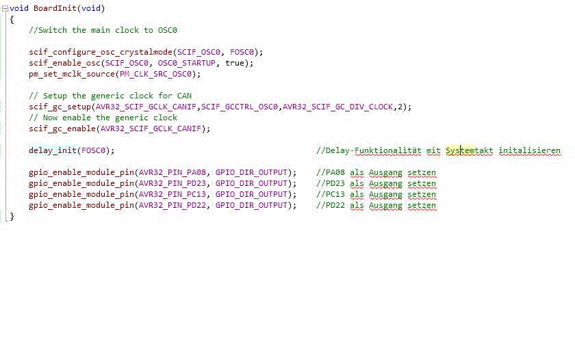 Hallo, ich benutze gerade auch der AT32UC3C0512C, um eine CAN-Kommunikation aufzubauen. Der CAN-Netzwerke sollte aus zwei CAN-Knoten bestehen, die Daten untereinander tauschen. Als erste Schritt, habe ich das UC3C CAN and LIN Loopback Beispiel so geändert, dass ein CAN-Kanal Daten periodisch senden und empfangen kann. Die beiden CAN-Kanäle senden und empfangen Nachrichten, aber nach einer gewissen Zeit, hängt das Programm. Das Programm ist im Anhang angehängt. Ich wäre über Ihre Hilfe dankbar. Laura