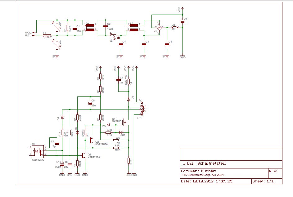 Hallo, mein Faxgerät ist kaputt gegangen.Um das Gerät reparieren zu können habe ich folgende Schaltung mir aus dem Platinenlayout gezogen.Allerdings ist mir dessen Funktion nicht ganz klar.Wer kann mir hier einen Tipp geben wie diese funktioniert? Ich vermute so: Der Transistor Q3 bildet zusammen mit Transistor Q2 eine Treiberstufe, die über das einseitige Verzögerungsglied rund um D3 und R10 den Schalttransistor Q1 ansteuert. Die Basis von Transistor Q3 wird entweder über den Optokoppler aufgrund zu hoher Ausgangsspannung oder über den Messshunt R13 bei Überstrom angesteuert, welcher Q2 Basisstrom liefert und dieser widerum das Gate von Transistor Q1 über R10 und R12 gegen Source zieht. Der Optokoppler bekommt seine Spannung - um Q3 zu schalten - über das Entkoppelglied rund um D4, R14 und C10 von der Hilfswicklung des Transformators. Was mich jedoch nicht klar ist, wie wird der Schalttakt erzeugt und welche Rolle spielen die Komponenten D2, R5 und C8. viele Grüße Leon M.