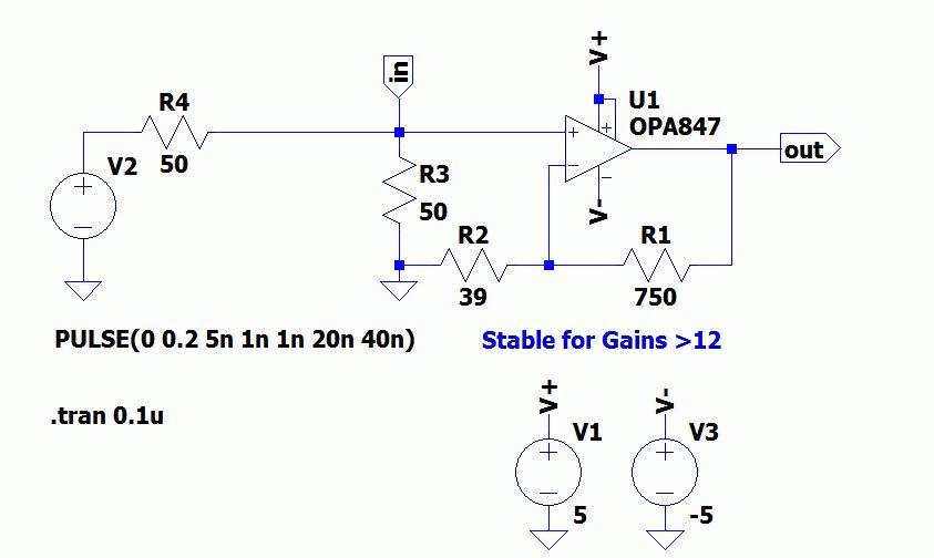 Hier jetzt das komplett gerichtete Beispiel. Wichtig: Alle Dateien in ein Verzeichnis kopieren. Dann RUN. In deinen Designs OPA847.asy und OPA847_Model.sub in den Ordner des Schaltplans kopieren.