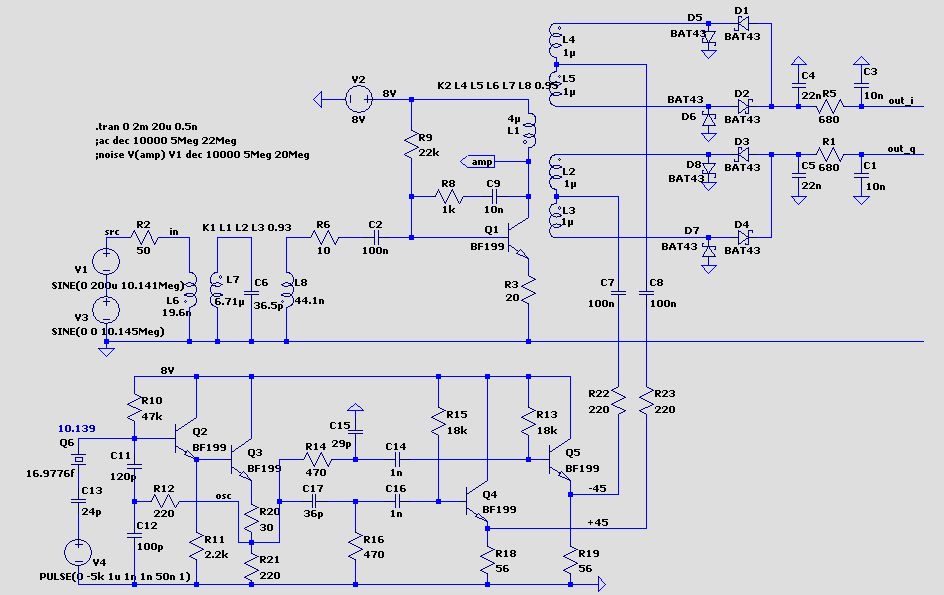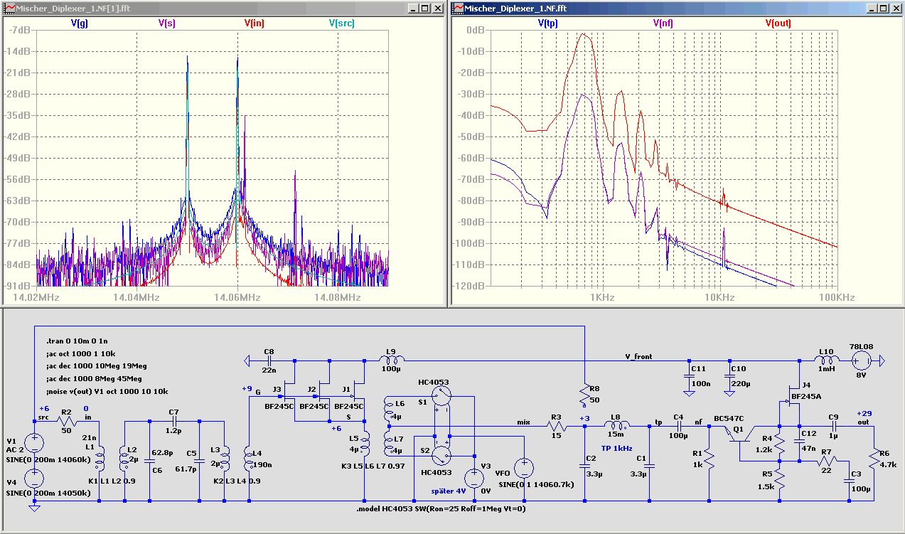 Hallo DAC Ich hab mit der angehängten Schaltung ein wenig rumsimuliert. Bis zum Mischer ist sie einigermaßen großsignalfest (IP3 = 21 dBm). Und Schaltmischer sind von Haus aus in dieser Hinsicht nicht schlecht. Der Analogschalter darf ja mit bis zu 9 Volt betrieben werden. Ein Problem der Originalschaltung liegt in der riesen Verstärkung der ersten NF-Stufe (37dB). Ab einem Eingangssignal von 20mV würde diese Stufe schon übersteuern. Deshalb hab ich versucht die Verstärkung per Gegenkopplung zu reduzieren, ohne beim Rauschen viel schlechter zu werden. Für eine gute Linearität wurde der JFet als Stromquelle eingefügt. Q1, J1 und R7 sind die hauptsächlichen Rauschquellen. Besonders R7 sollte deutlich unter 50 Ohm bleiben. Im ersten Dokument gibt es eine Abhandlung über NF-Filter für DC-Receiver. http://www.azscqrpions.org/Tuthill_filter_presentation_08-09.pdf http://www.norcalqrp.org/files/austinnc2030presentation.pdf