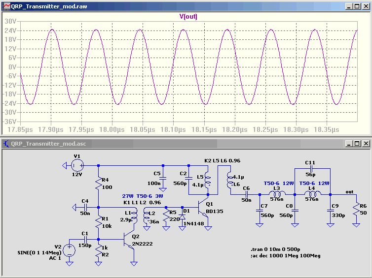 PS: bei 50 Ohm direkt an C6 (in deinem Schaltplan, ohne TP) bekomme ich nicht mehr als +-7V Spitze... Was macht C2 parallel zu L5? (f(R) wäre ca. 3,3MHz) Schätze, C11 und L4 bilden einen Resonanzkreis zur besonders effektiven Abfilterung der ersten Oberwelle (ca. 28MHz).