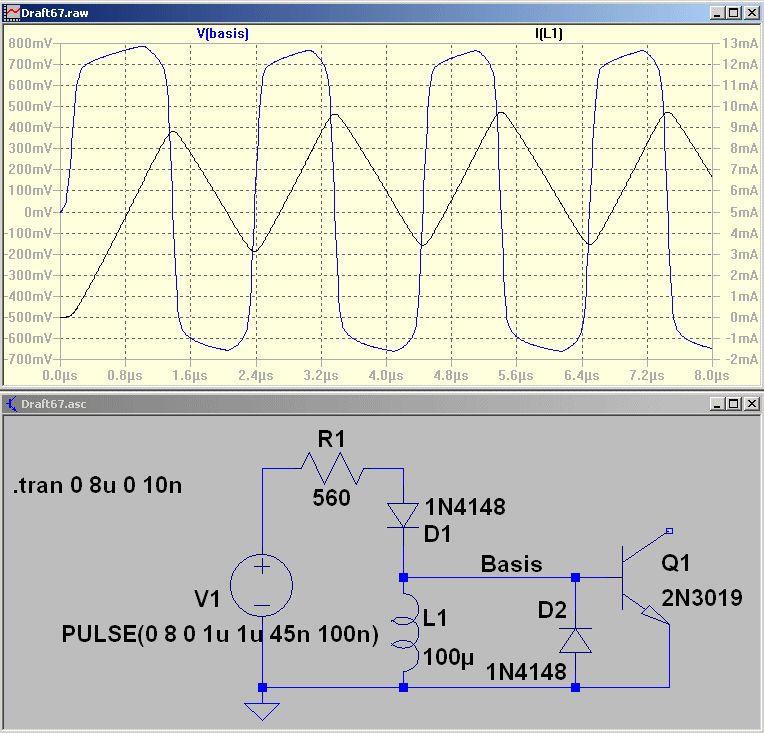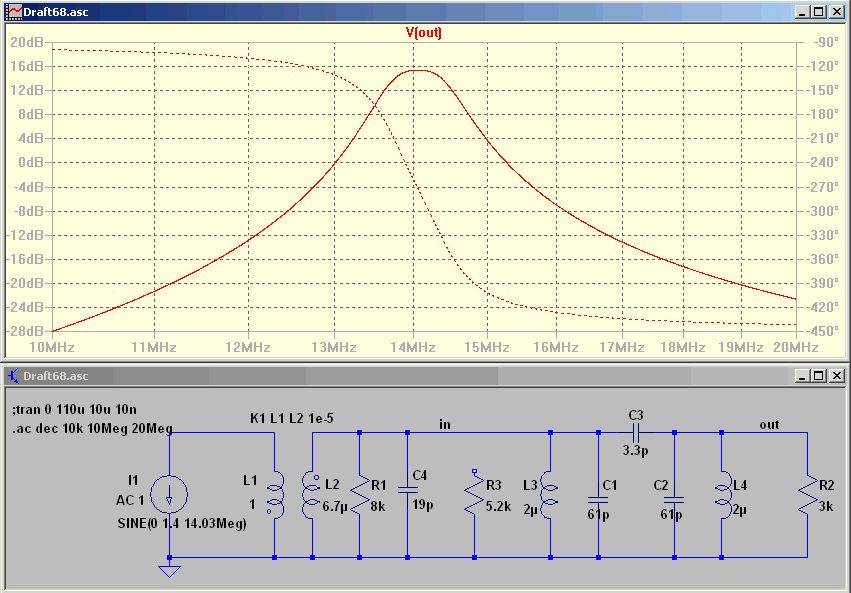 >> Sowas ähnliches gibt es schon: >> http://py2ohh.w2c.com.br/trx/caiapo/caiapo.htm > Man könnte fast meinen, die Spule an der Basis > vom BD139-16 fungiert als eine Art Spannungswandler...?!? Die Spule wirkt als Stromspeicher. Schaltet der 4066 ab, möchte der Strom in der Drossel in die gleiche Richtung weiterfließen. Dadurch polt sich die Spannung um und der Transistor schaltet schnell ab. Die Spannung an der Basis schaltet zwischen 0,7 V und -0,7V hin und her. > wie man die Impedanzen anpaßt und wie der C in der > "Mitte" dimensioniert sein muss für eine kritische Kopplung? Sowas simulier ich immer in LTspice, wobei ich versuche, die Spulenverluste so gut wie möglich abzubilden. Bei AADE gibst Du eher die Frequenz und die Bandbreite vor und bekommst einen Vorschlag. Dann gebe ich immer nochmal die Schaltung in LTspice ein zur Gegenkontrolle. Hier muß auf jeden Fall die Loopinduktivität mit in die Berechnung einfließen. Die erste Schwingkreisinduktivität und die Loop liegen ja parallel. Dadurch muß das Ganze mit einem größeren C wieder auf 14 MHz gebracht werden. Dann wird kein Widerstand zwischen Loop und Filter benötigt.