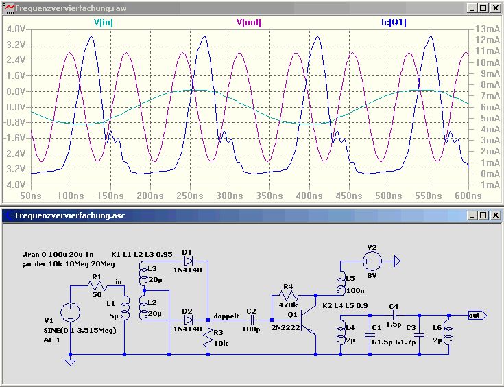 > Ausgezeichnet! Wo gibt es diese 3,68 MHz-Schwinger? Manchmal in der Bucht, dieser hier hat aber leider die falsche Frequenz:#160693508321. Bei Dreibeinern muß man aupassen, daß keine Cs integriert sind, sonst läßt sich die Frequenz kaum ziehen. Momentan sind da keine zu finden. Bei Farnell sehe ich gerade, es gibt: 3.58, 3.64, 3.68, 3.69, 3.84 MHz Von den Beiden könnte man sich das Datenblatt mal genauer ansehen: CSALF3M58G55-B0 und CSALF3M69G55-B0 Frequency Drift -20 .. +80°C: +/- 0,3% max. > ist sekundärseitig eine 1N4148 Wird sie warm, wenn Du sie umpolst? > Der Übertrager ist ein kleiner Ringkern > Möglicherweise ist die so entstandene Kapazität zu groß Die parasitäre Kapazität liegt sicher im Bereich von 1-2pF, das sollte kein Problem sein. Der Transistor hat viel höhere Kapazitäten im 10pF Bereich. Mir erscheint es etwas schwach, wenn so wenig im Weltempfänger zu hören ist. Bist Du sicher, daß der Oszillator/Puffer ein kräftiges Signal liefert? Nicht daß der Oszillator so vor sich hindümpelt. Da sollten schon ein paar Volt rauskommen. Mit einem HF-Tastkopf nachmessen: http://totalitaer.de/Rftechnik/hftastkopf.htm Als Dioden kannst Du die BAT43 nehmen. > der Arbeitspunkt mit 3,5V von der Basis In der Simulation sind es 2,9-3 Volt DC.