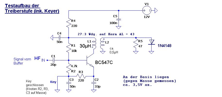 Hallo, danke euch für die Antworten und Ideen! Habe mittlerweile die Treiberstufe und die Endstufe so weit fertig (allerdings noch ohne TP-Filter). Schaltplan im Anhang. Beim Vorbild-Schaltplan (s.weiter oben) ist allerhöchstwahrscheinlich der Keyer falsch eingezeichnet, bei mir ist er jetzt direkt am Emitter. Es gibt noch ein paar Schwachstellen, morgen mehr dazu; auch zu euren Antworten... Viele Grüße und schönes Wochenende!!!